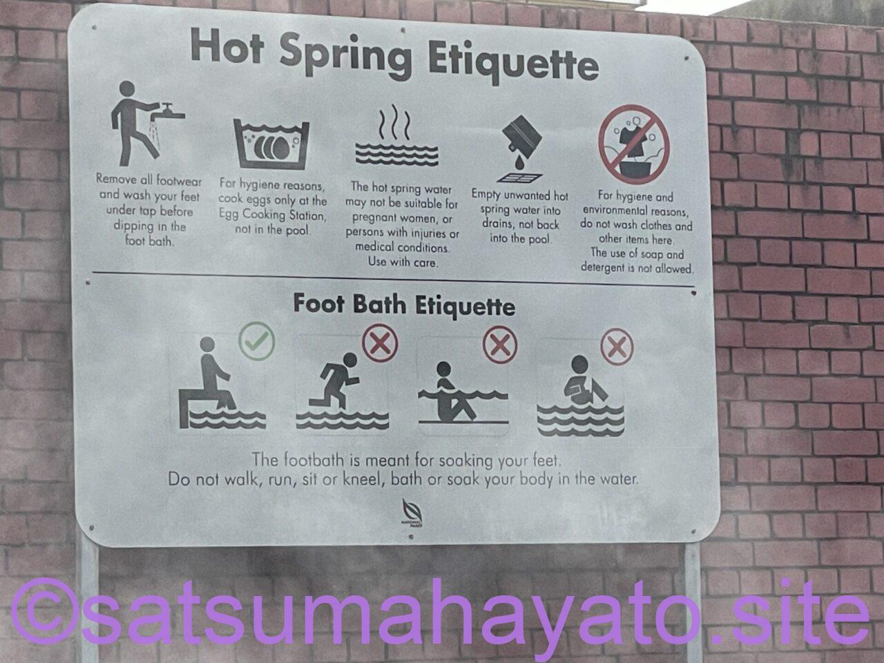 「足湯で”腰からつかるのは禁止”」の旨が掲示されている。以前その行為をした男性がSNSで報じられたためか、”足湯ではなく、温泉卵を作るためのスペース(温泉持ち帰り用蛇口スペース)で温泉をペットボトル使って浴びます”男性が出没。使う時に後ろめたさがあるのか周囲をキョロキョロ伺ってからやってた。確信犯や。