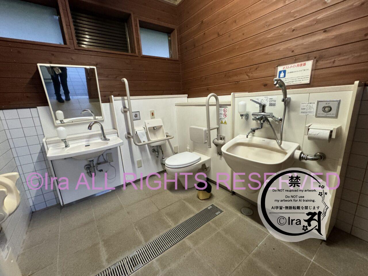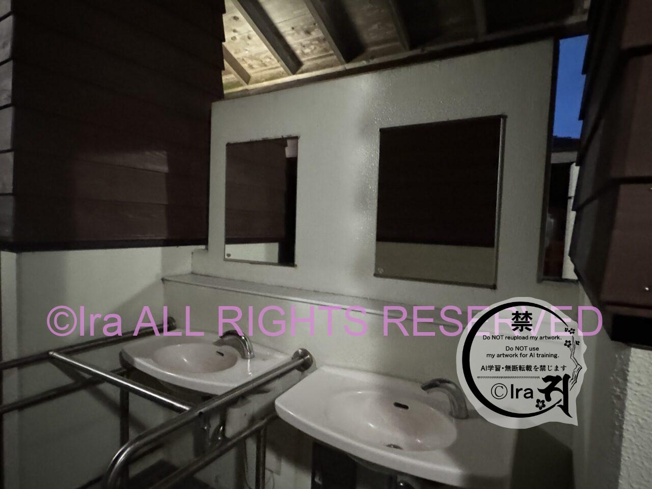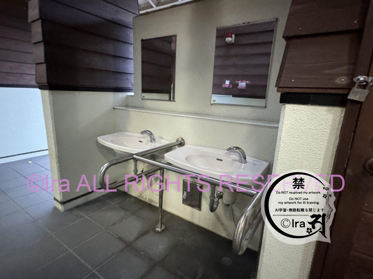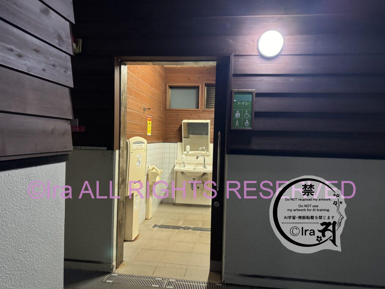 男女別と障害者向けトイレ。ハンドソープはありませんが、鏡が複数用意されていました。下記3枚は5月の17時頃の撮影。