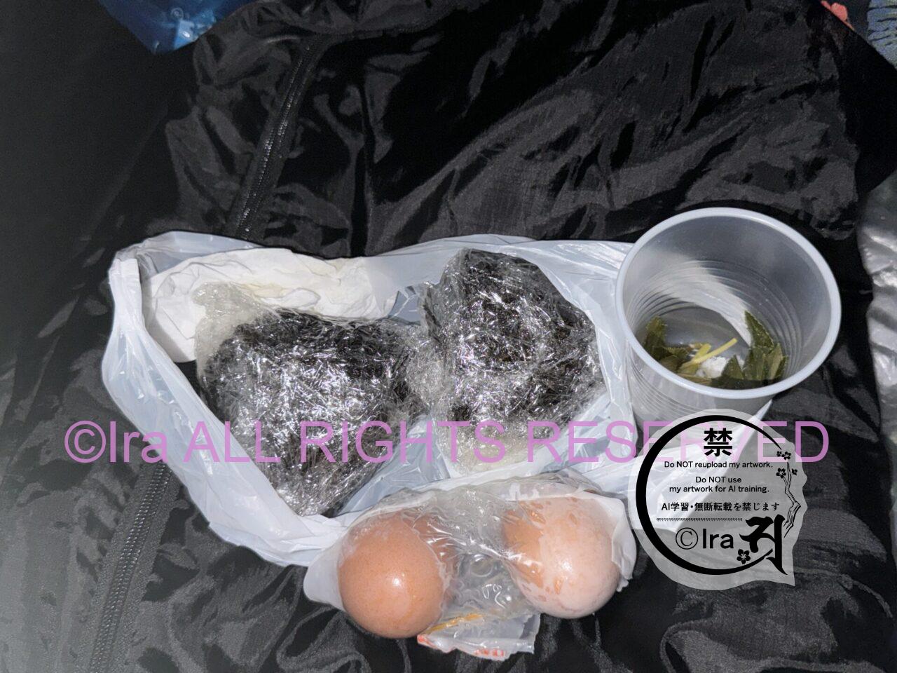 青ヶ島のひんぎゃでこの日の朝調理した、明日葉と卵。おにぎりは青ヶ島の人から無料で2個プレゼントでした。