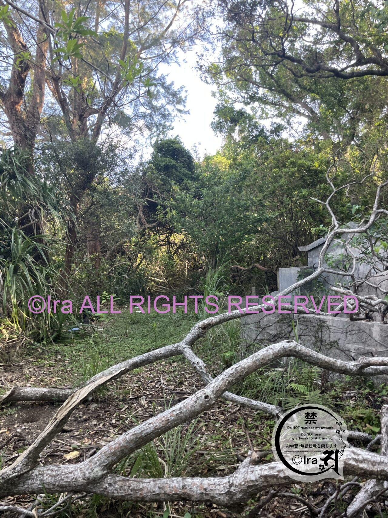 墓の前と茂みを通った先にあるヤガンナ島(無人島).沖縄旅行途中でお墓があった 道という道はありません。途中から茂みに入る形でした。夏撮影...