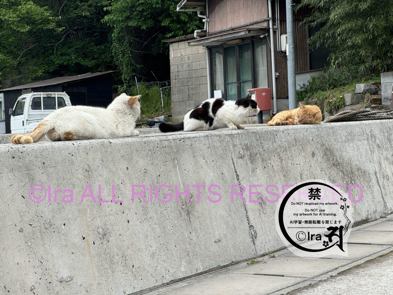 毛虫を食べようとする猫.三角関係の猫.岡山県笠岡諸島真鍋島