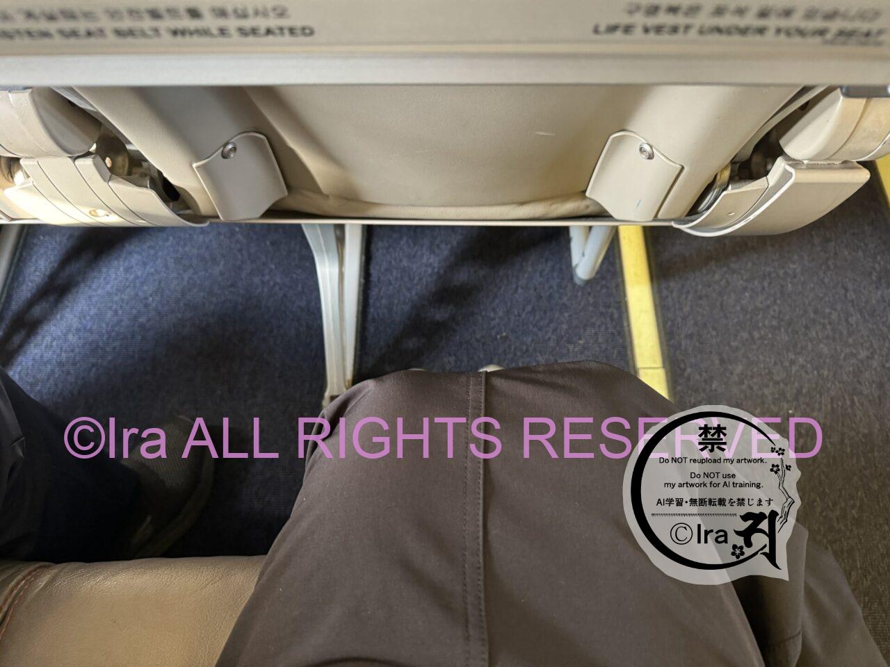 Sサイズのスーツケースは預け荷物。移動時間が短かったので窮屈ではない。個人的な感想としてはjeststarよりは少し広く感じた。椅子はやや座りづらいかもしれない。