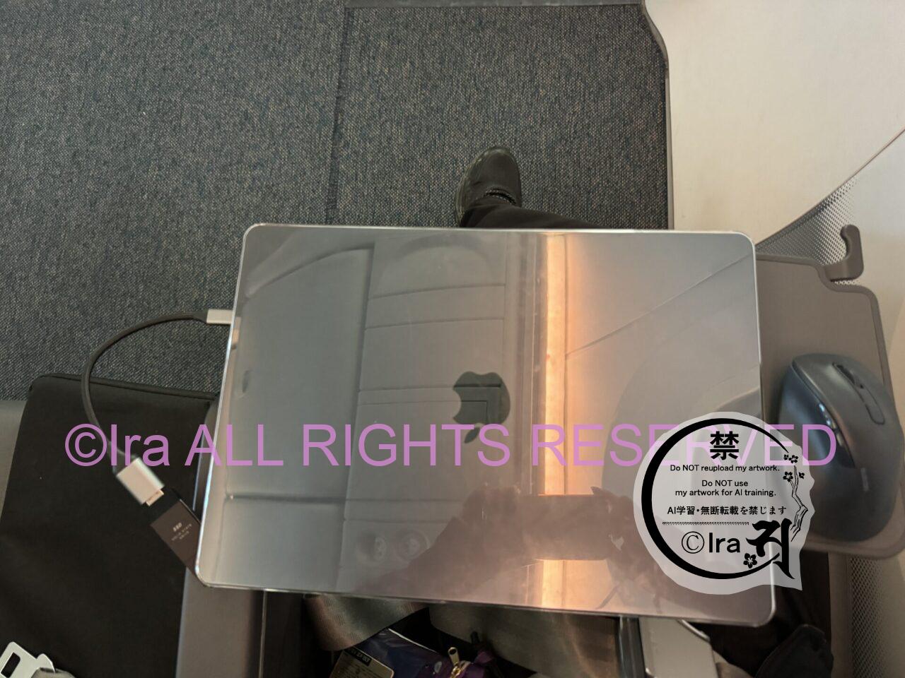 2024年発売のmacbook air3をこの席で使っています。マウスは大型だけどギリギリおけました。