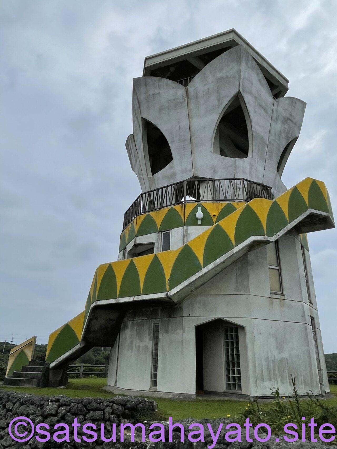 5月の写真です。花のつぼみのような形の展望台は、窓も個性あふれている三角形です。この窓の内側から撮影するとなんだか中東や東南アジア的な画になりました。写真をご参照ください。