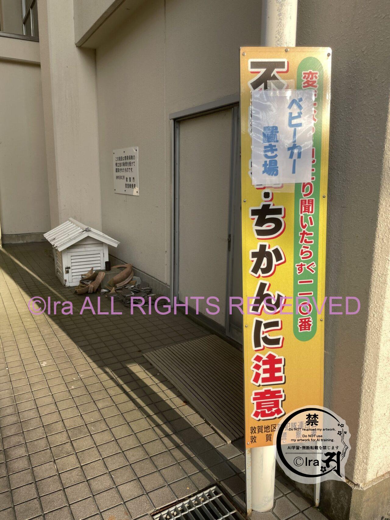 ”ベビーカー置き場”の紙が貼られてあるけど、警察が設置した看板の上に貼って本当にいいの??!!!