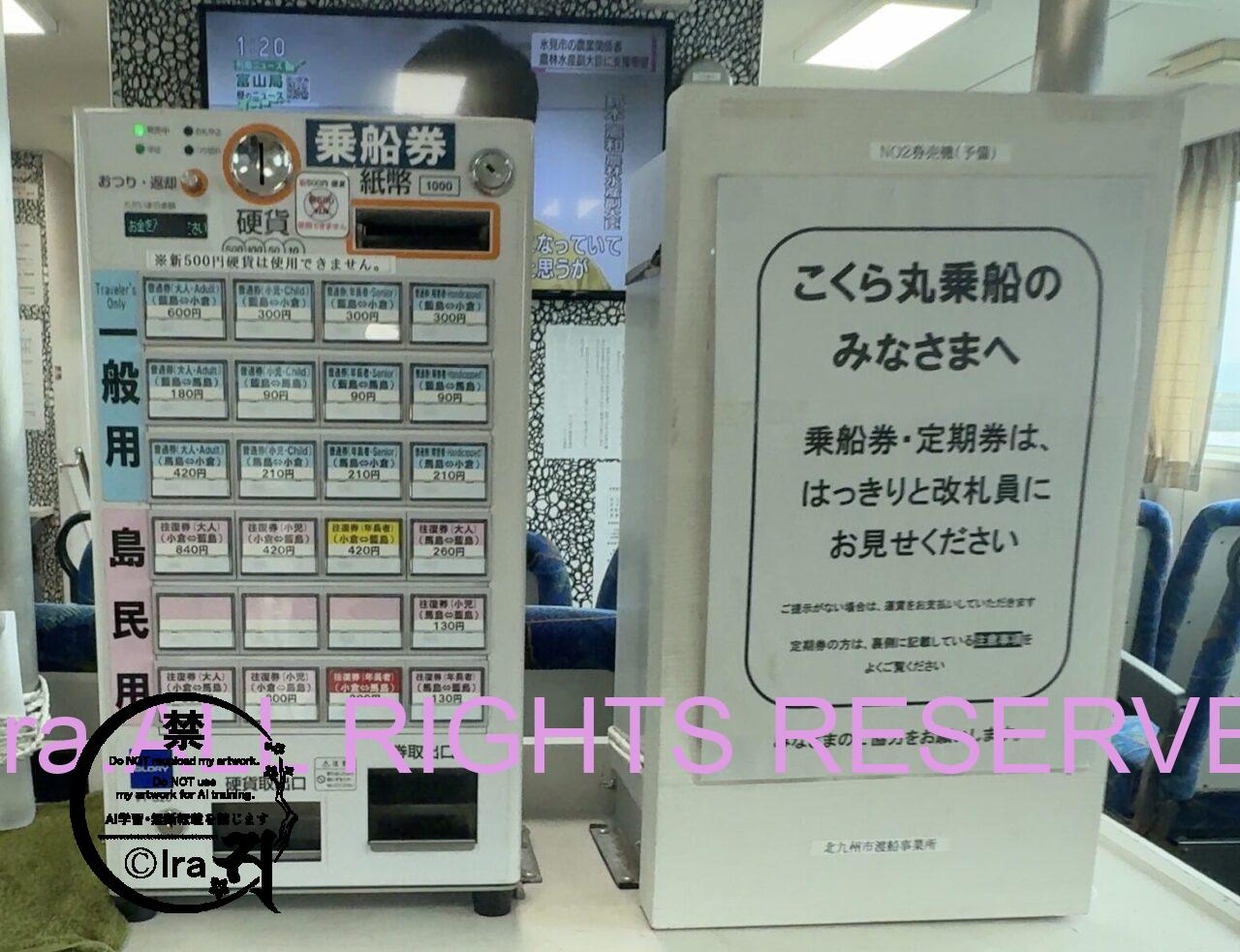 離島からの乗船は、船内で乗船券を購入した。現金決済のみ。新500円玉は使用不可。紙幣は1,000円のみ使用可。