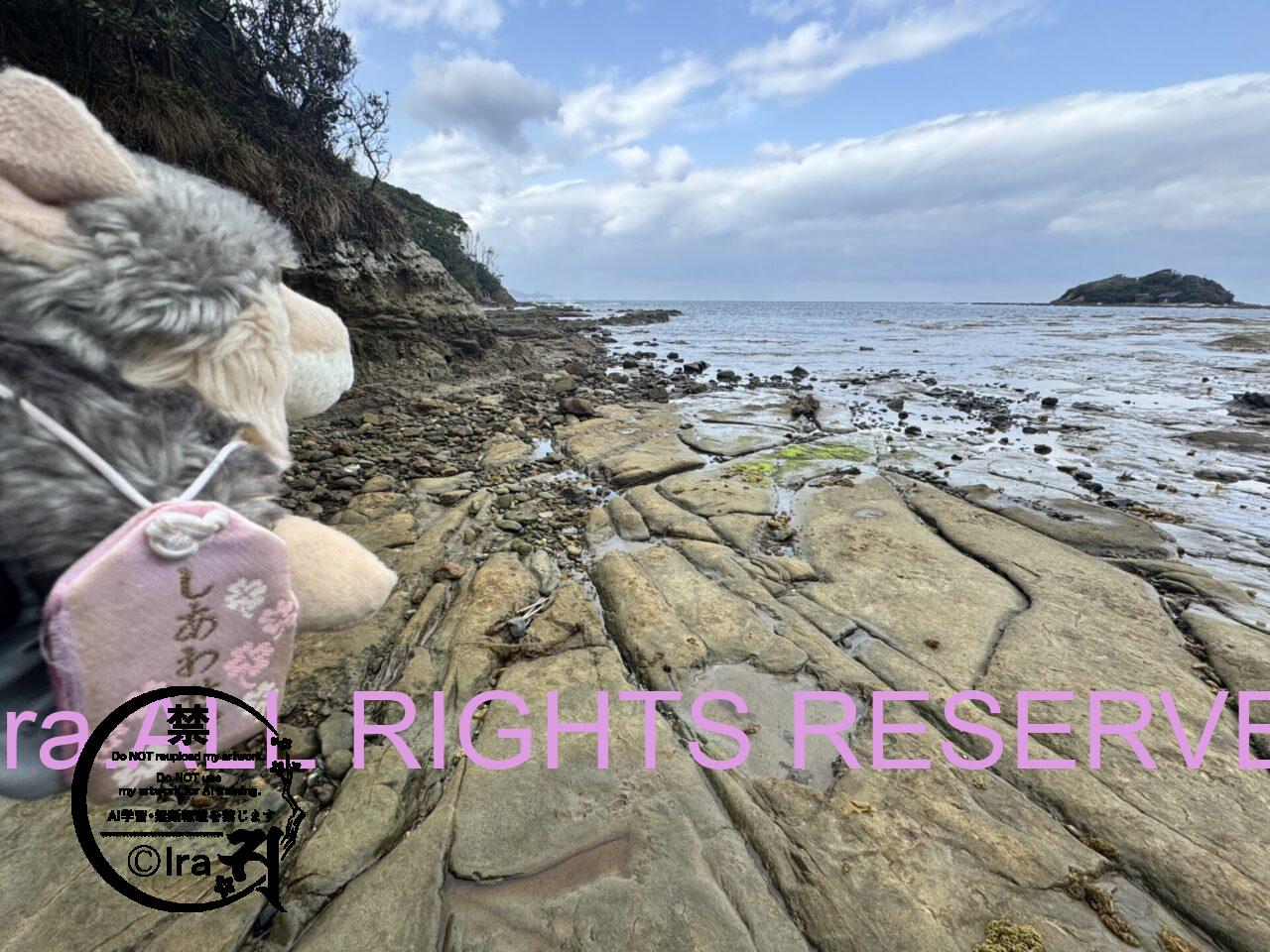 潮が引くと畳を敷いたような広い岩盤が一面に現れる場所。目の前にある無人島の「貝島」、右手には無人島の「姫島」を見ることができ、干潮時にはどちらにも歩いて渡ることが可能。