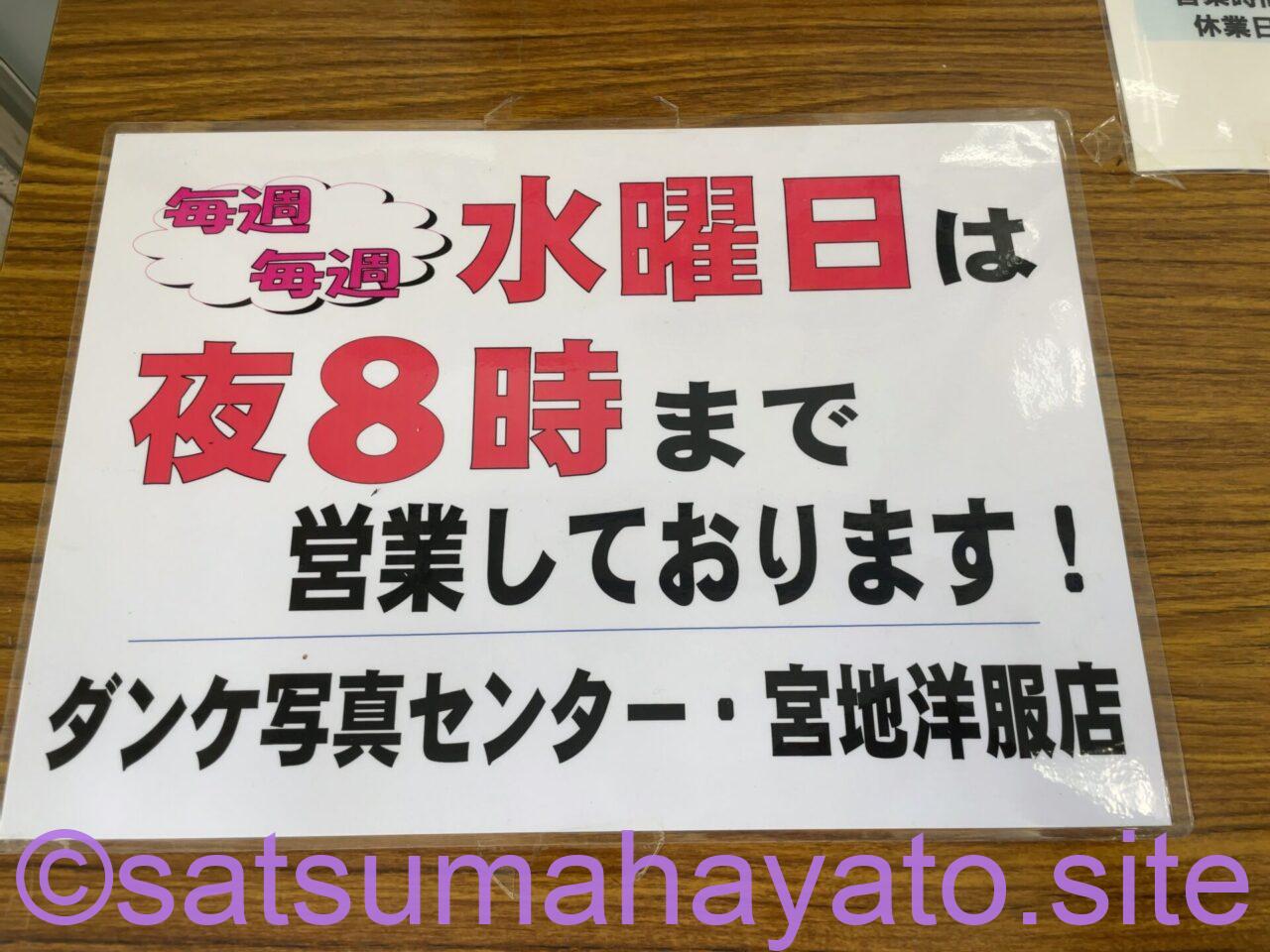「毎週毎週水曜日は夜8時まで営業しております!」と買いてある。