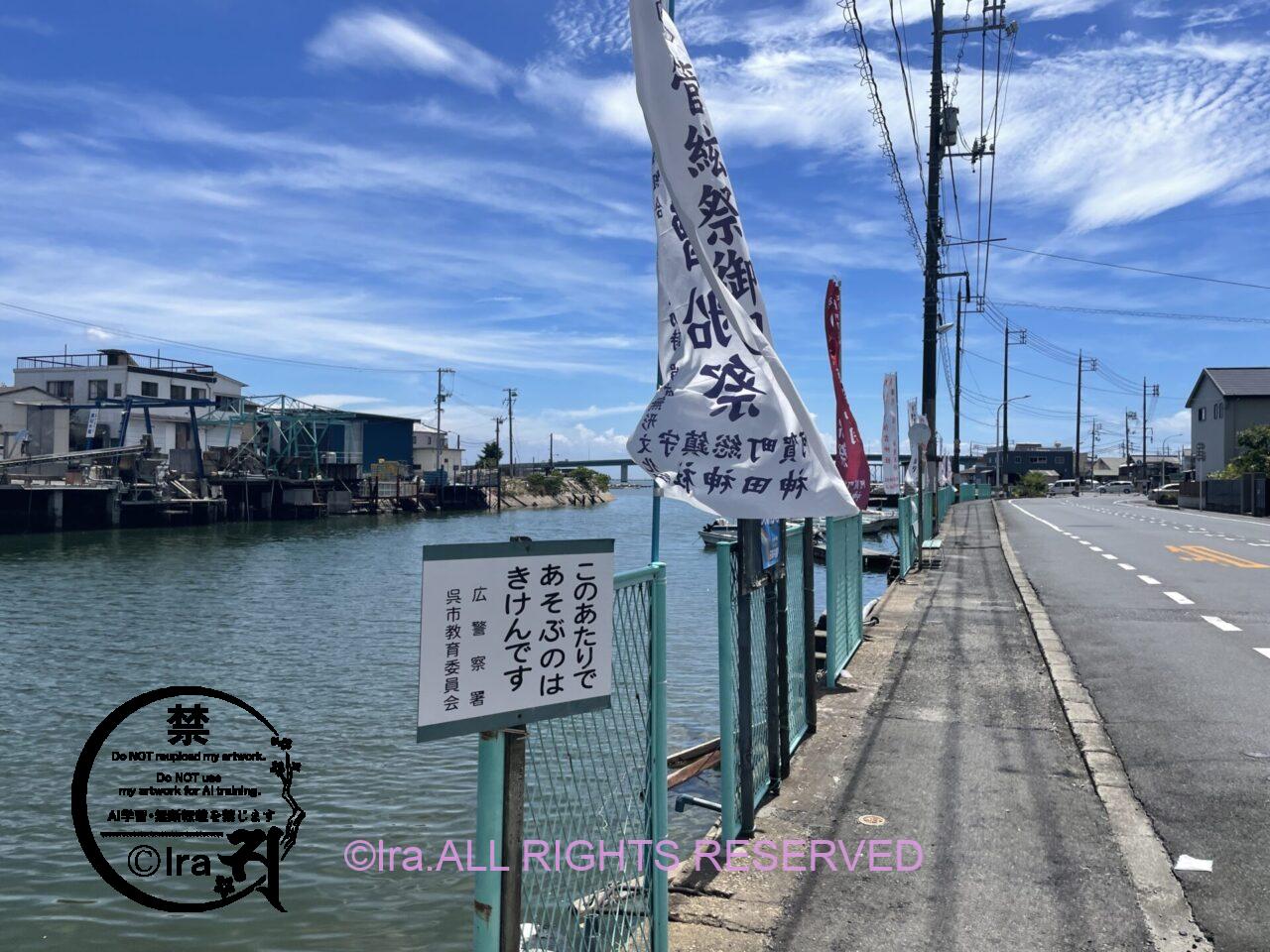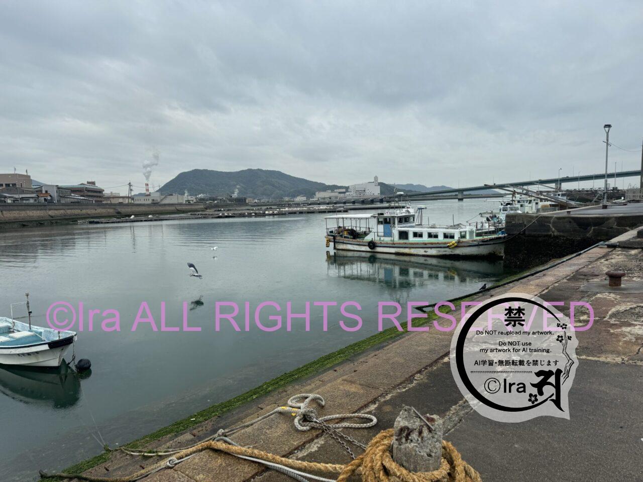 この写真の道を川沿いに歩くと港がある。最寄り駅から徒歩17分程度の港。