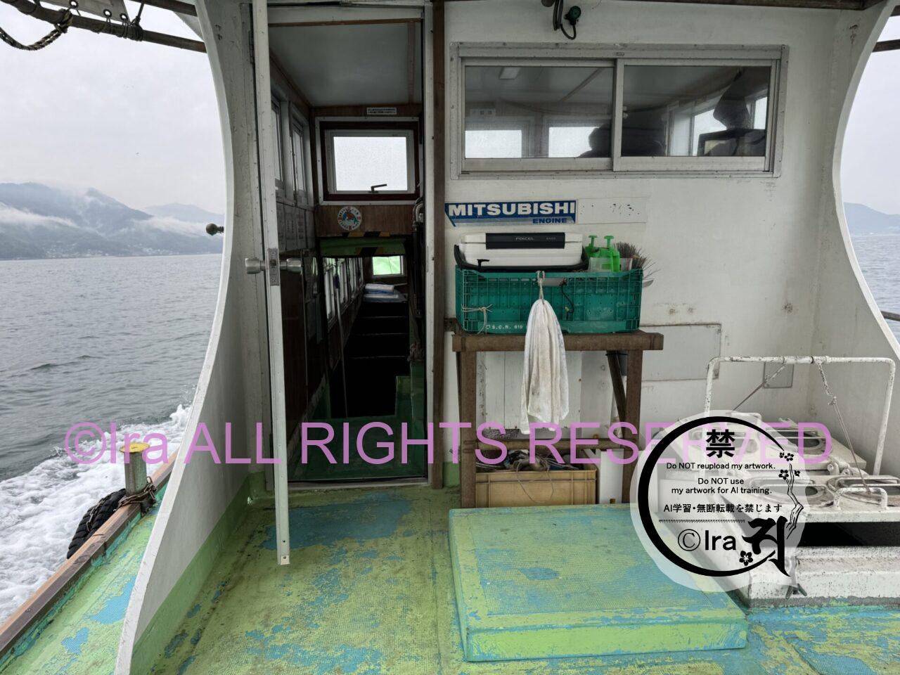往路は外で撮影してました。復路は情島から離れたあとに船内で撮影してました。往路は船内に船長がいました。