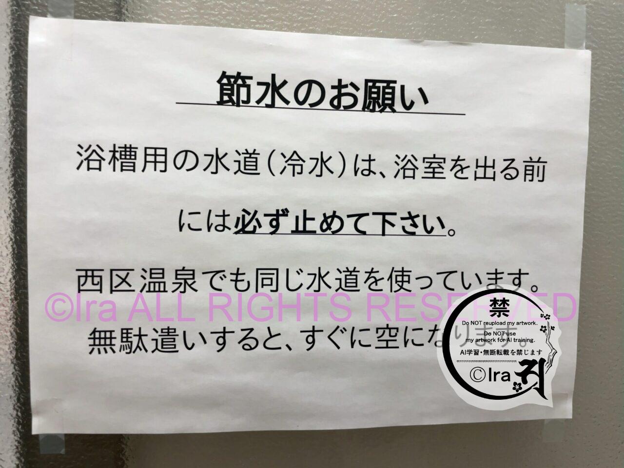 「島の水には限りがあるので、水を使う時は控えめにしてください。すぐに水がなくなってしまいます」という主旨の日本語の張り紙。