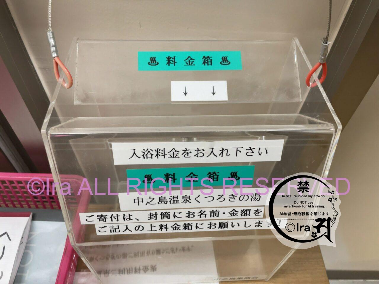 入浴の料金は現金をこの中に入れる。300円です。お釣りが必要な人は窓口の奥にいる人に声をかけてください。