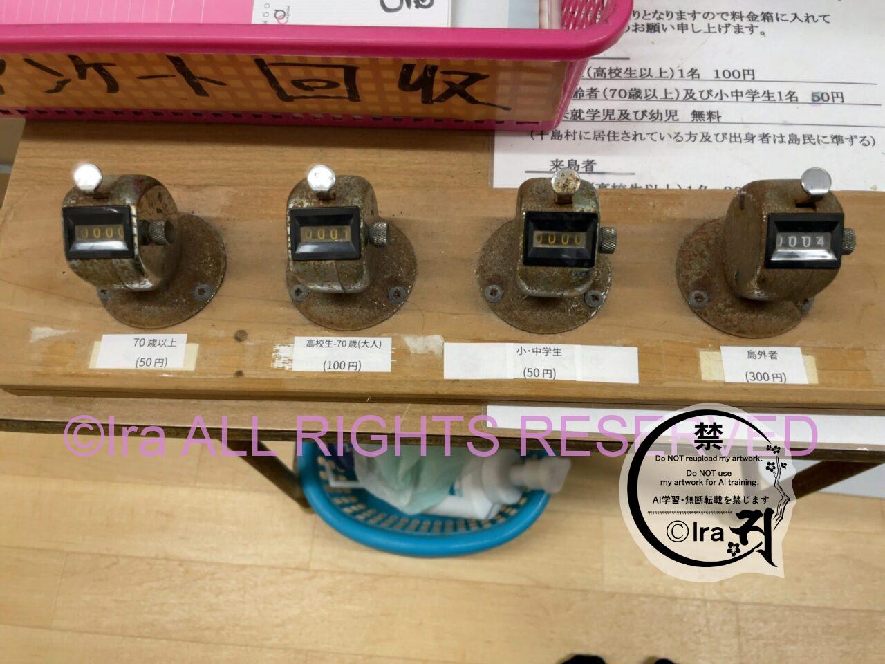 料金を投入したら、利用者の人数をカウントするために、該当するものを1カウント分押します。この島に住んでいない人は一番右のマシンで1カウント分押してください。