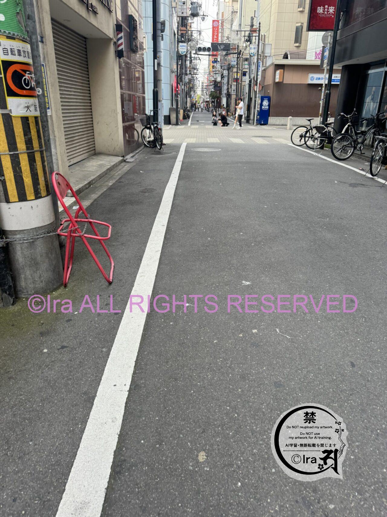 心斎橋周辺の朝5時台。ホストクラブの客と従業員らが路上でタクシー待ちしていた。朝からうるさかった人たち。赤い椅子は座面がない。なんのためにここで固定されているか不明な椅子。