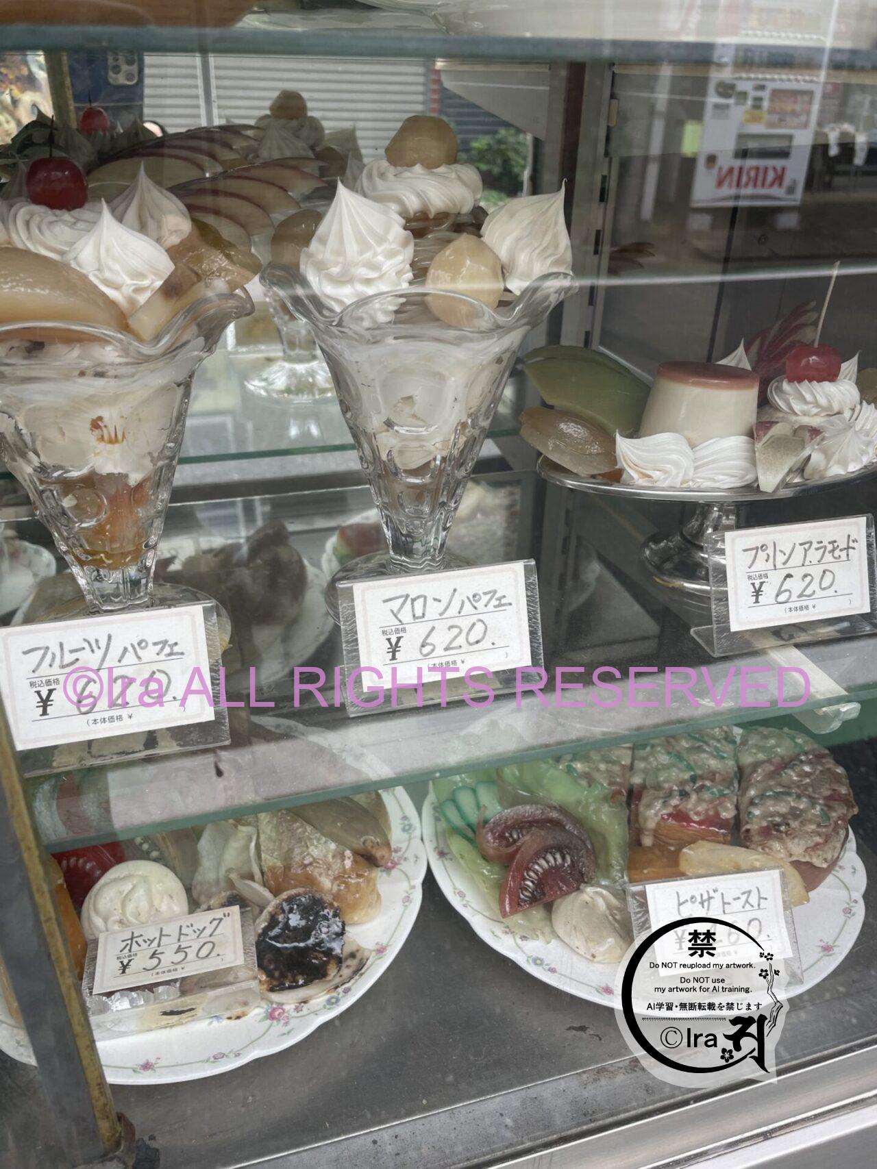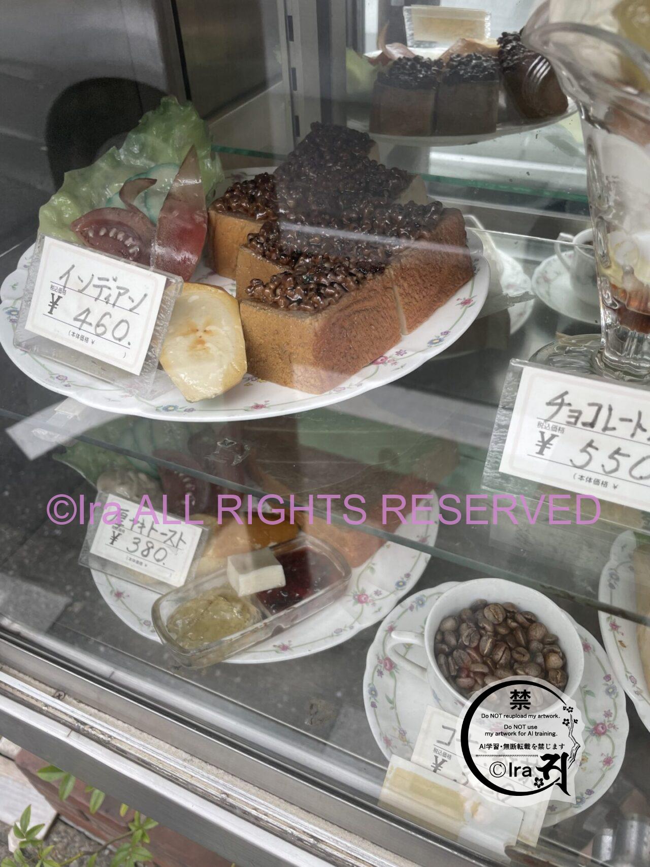 屋外はこのようにレプリカが展示されておりわかりやすいのですが、店内のメニュー表を読むだけだと商品のイメージがわきませんでした。入店前に脳に記憶させる必要がある喫茶店です。客は、記憶力を試されています。