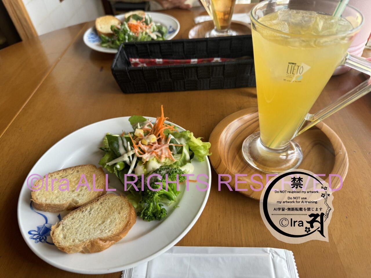 友人はアイスティーを注文。僕はオレンジジュースです(果汁多め)。サラダに粒々コーンや細切りニンジンも入っていてバラエティーに富んでいます。ドレッシングは店頭でも販売されていますが味付けが抜群に良いです。トーストされたパンも美味しかったです。