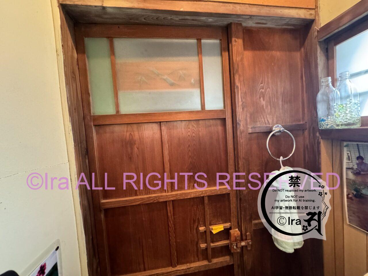 トイレの入り口。トイレは1つのみ。電気は廊下とキッチン(オーナーの作業部屋)にある。