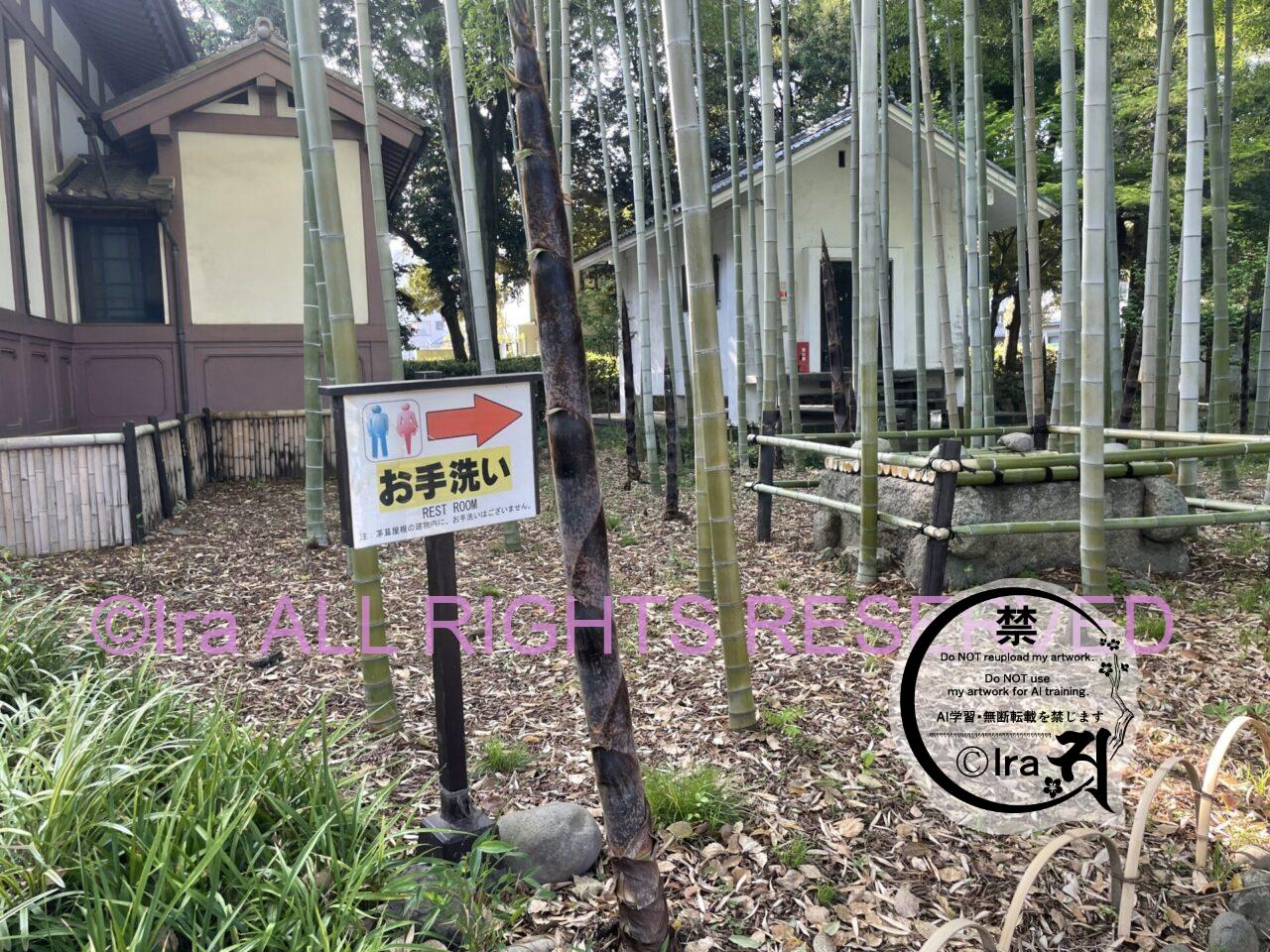 お手洗いの看板の隣に生えているたけのこは、2m以上に成長。ちなみにお手洗いの場所は少しわかりづらかったです。この矢印方向にまっすぐいった先が正解ではありませんでした。
