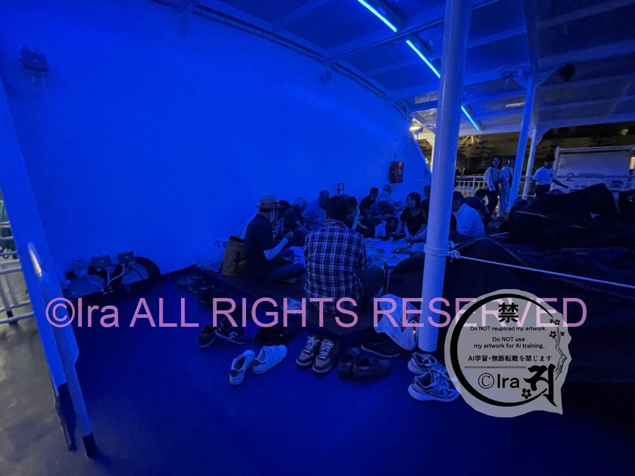 港とは逆にフェリーのデッキは賑やかになった。日本人の桜や花見などの宴会の雰囲気に近い。上野公園とか。