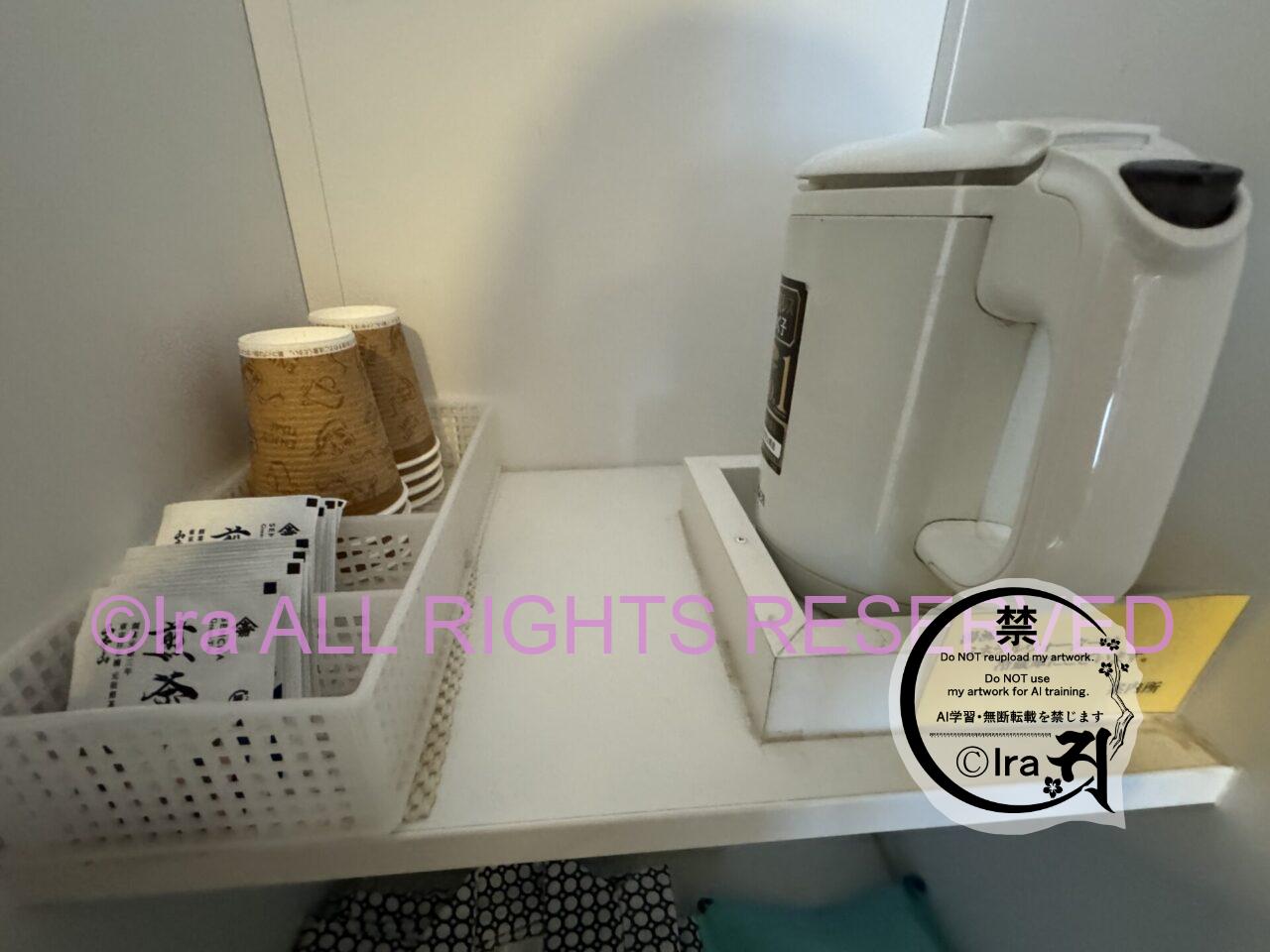 水は冷蔵庫のミネラルウォータを使用。紙コップとお茶のティーバッグがある。