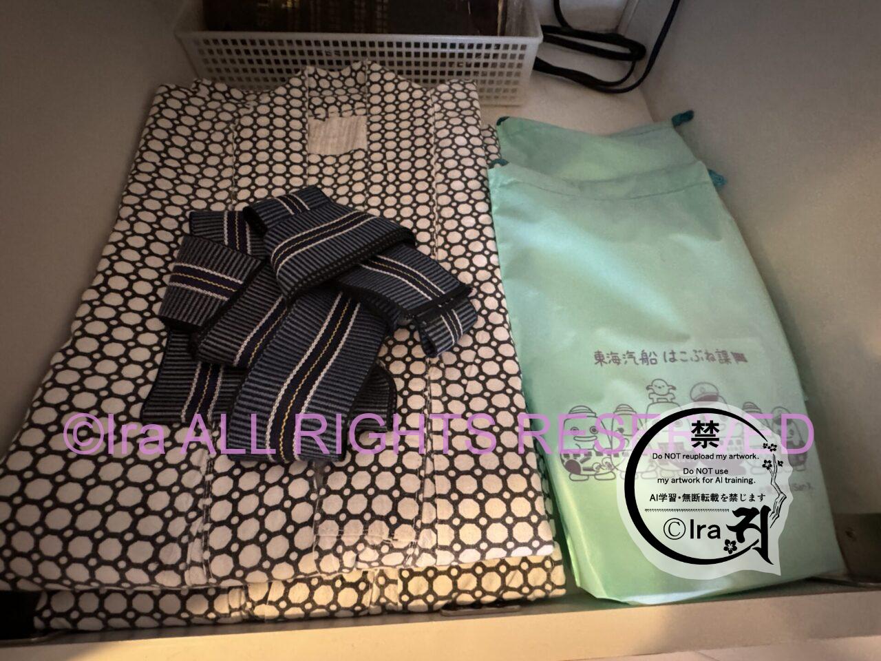 寝巻き、フェイスタオル、歯ブラシと歯磨き粉、のセット。
