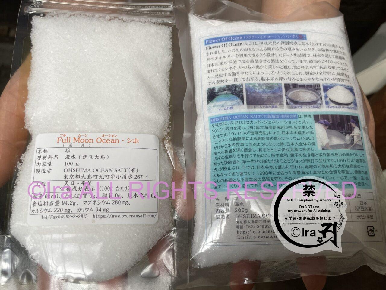 生き急ぎ野郎Ira新月の塩は取り扱いありません。「新月は海のパワーが大きすぎて機械が故障したり、何度試しても普段通り作れなかったので、作った塩は全て伊豆大島の海に戻した」旨をIraに取材で話してくれました。