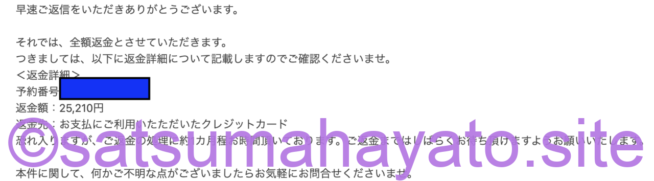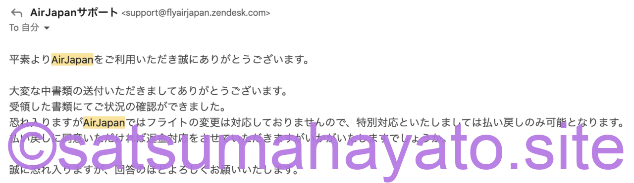 夕方頃返信あり。早いですね。僕はフライト変更可能かあわせて質問したのでワンアクション多くなっています。たいていは1度のやりとりで完了のようです。
