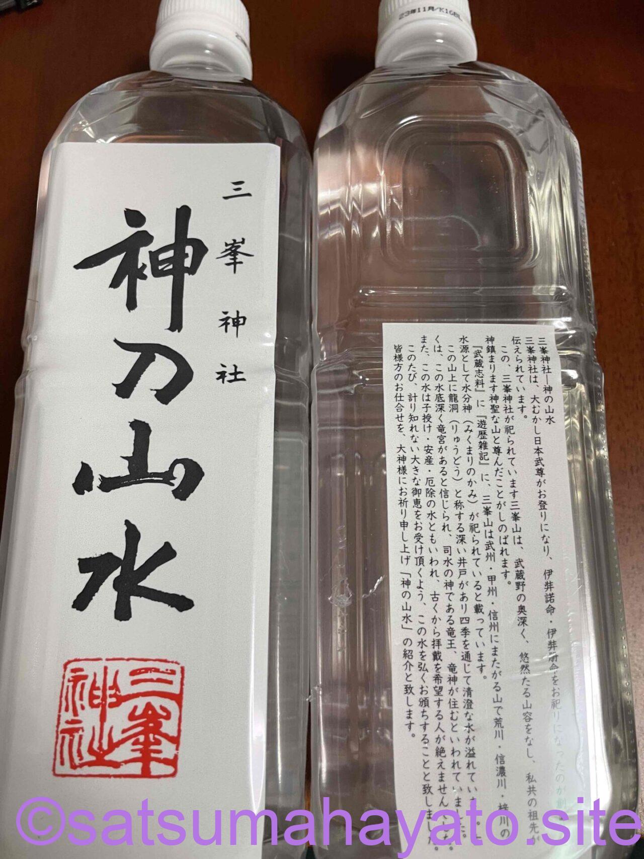 三峯神社の敷地内で組み上げられた水。甘くて飲みやすい軟水。1本500円。1,100ml。