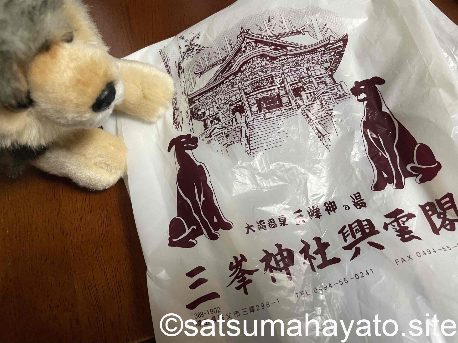 狼のぬいぐるみと有料の袋(小:茶色。大:青色)
