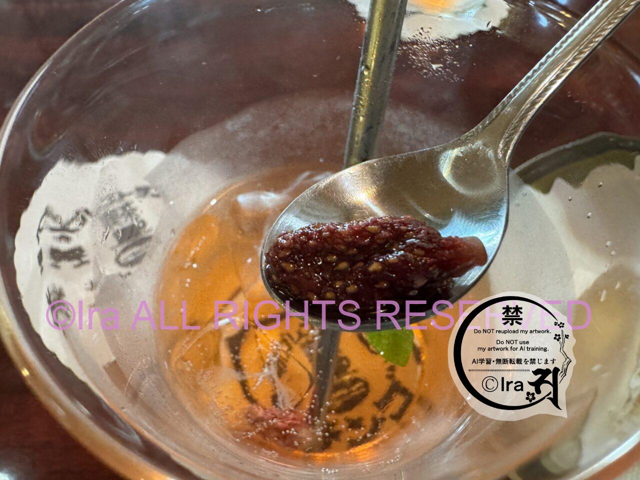 生苺をカットして入れている店が圧倒的に多い中、こちらではドライフルーツ。生苺は酸っぱい。ドライフルーツは甘いのでこちらの方がドリンクに適している。前者は調和を乱す系