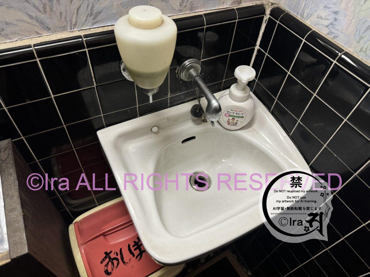 このサイズの手洗い場所は日本ではかなりレアになっただろう。おしぼりはこちらのスタンドに入れるルール。