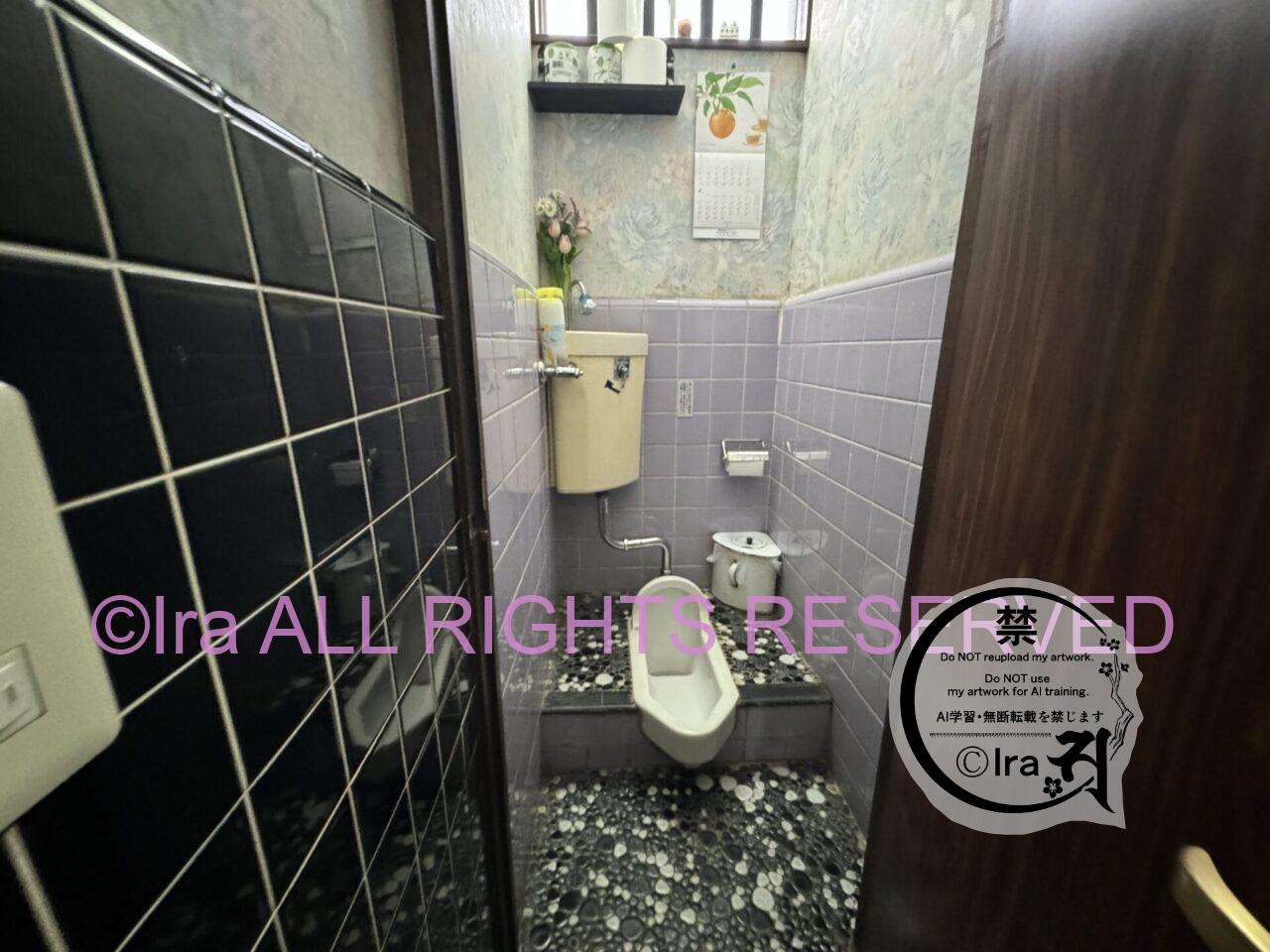 トイレ。昔は”ボットン便所”だったと思われる。現在は下水仕様。和式1つのみです。トイレの床のタイルも今では貴重なレイアウト。丁寧に隅々まで清掃されていた。