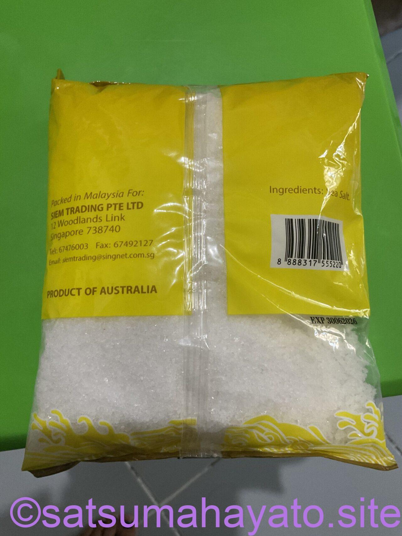 スーパーマーケットで最もみかけるのはオーストラリア産のこの塩でしょう。近所のスーパーでは1袋500gが60セント(約65円)で販売されていました。