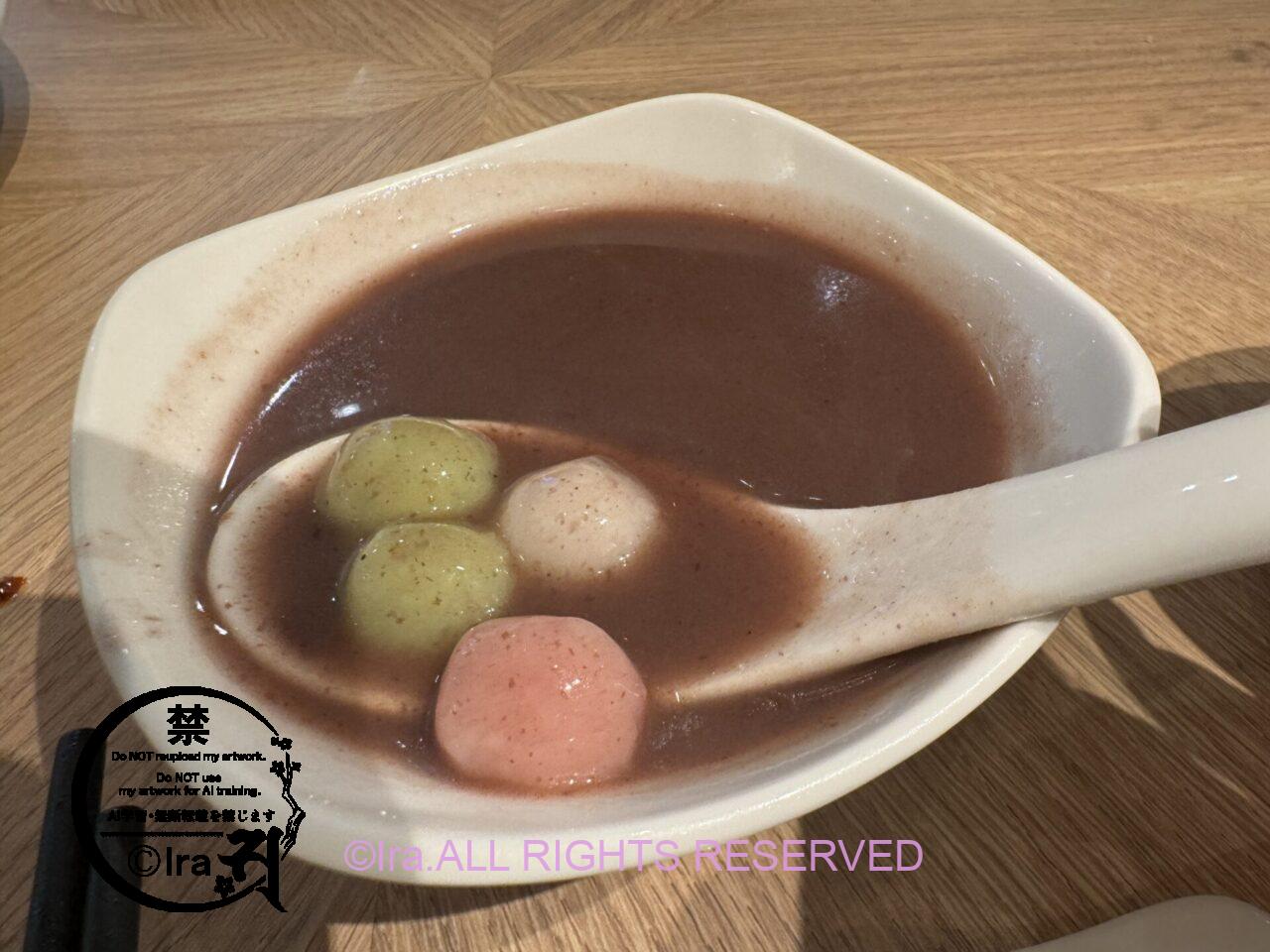 麺料理とおしるこ系スイーツ。このスイーツはこのレストランで食べる価値が見出せなかったのでコーヒーショップとか他店で食べても十分だと思いました。