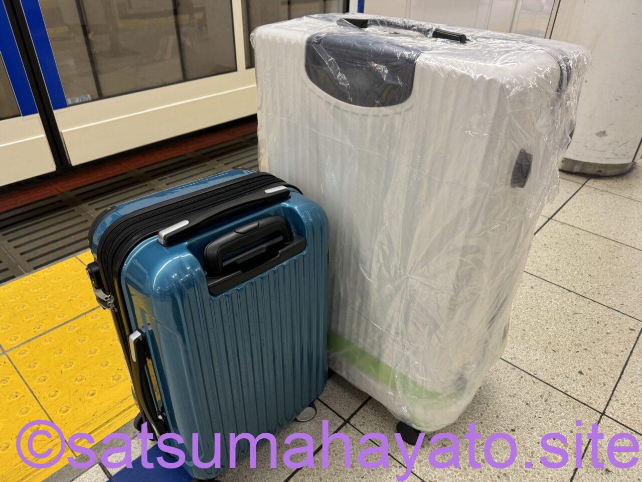 この写真のスーツケース2つ+リュックで計40kgでした。いずれも本体は超軽量型のため防御力が低い。預け荷物は丈夫なビニール袋で梱包。