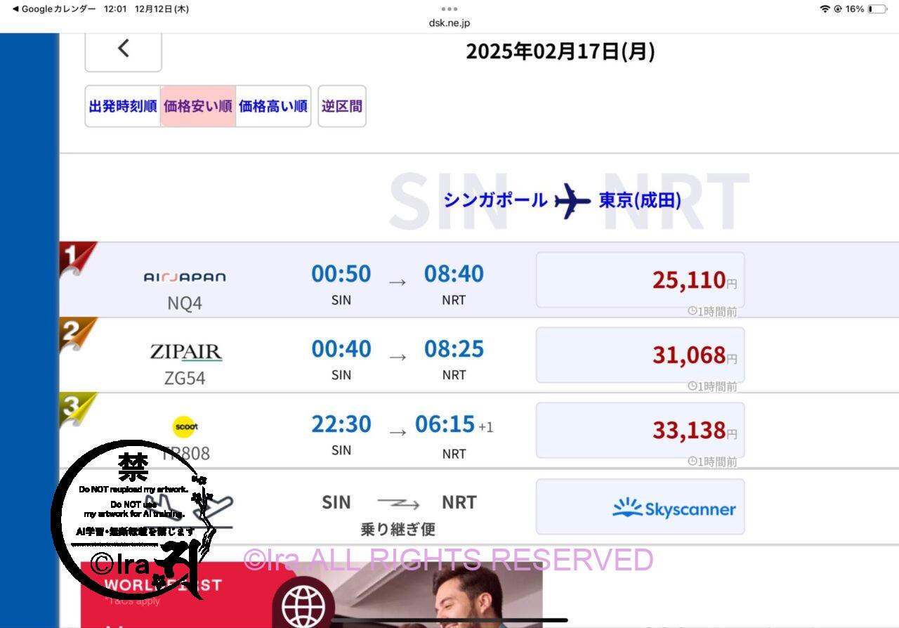 セール価格で片道5万円台のSingapore Airlineより、片道18,000円台ZIPAIR23時着で充分です。