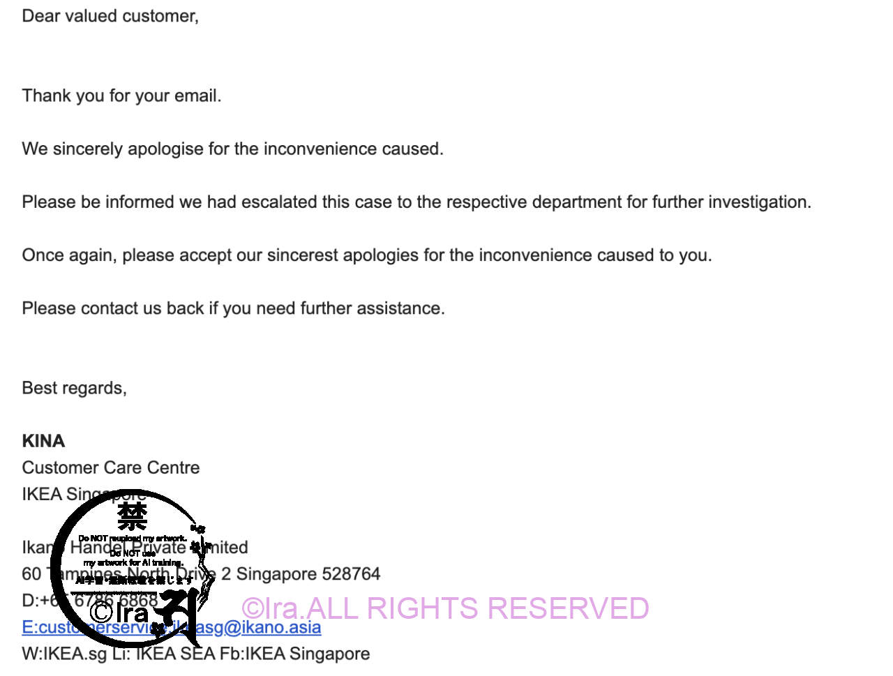 それでIKEAのシンガポール支店に問い合わせ返事がありましたが、安全性についてはノーコメントでした。