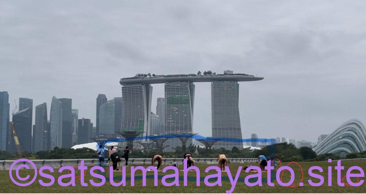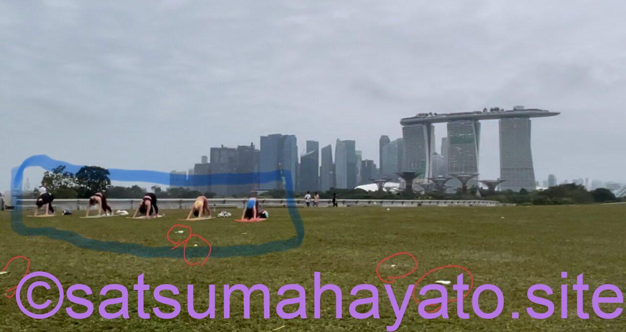 そんなゴミがたくさんあるマリーナベイの芝生の中で、初日の出にあわせてヨガをしているグループがいました。