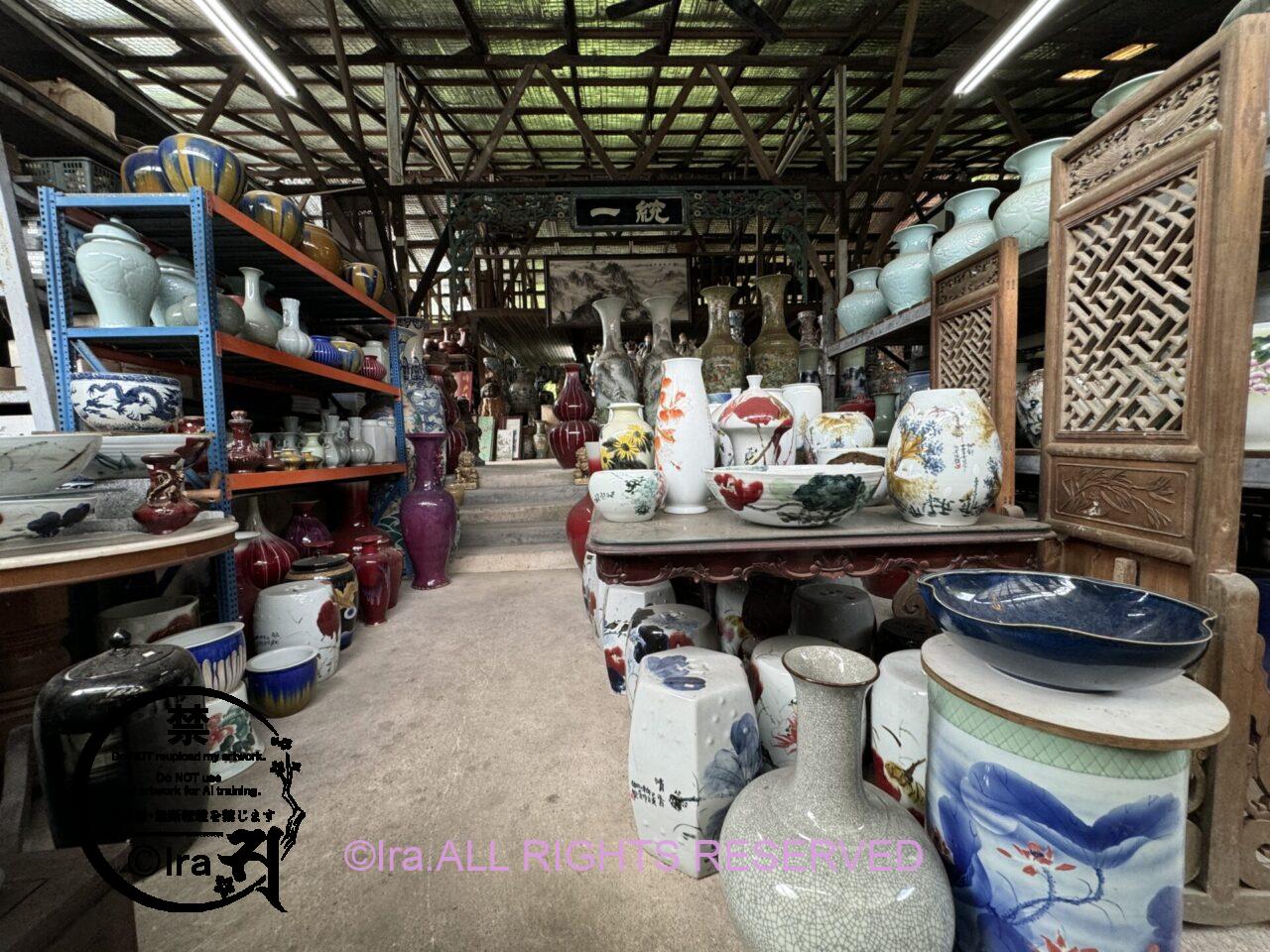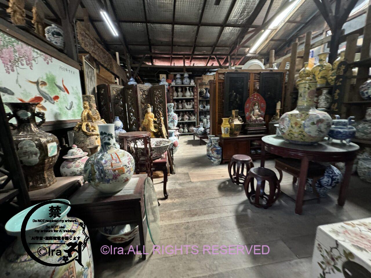 奥にあった100個近い展示は全て別部屋に山積みにされ(屋根はあるが風はあたる。窓がない)、巨大展示品は他商品で隠れてしまい、2月に見た、おしゃれでゆとりあるレイアウトは皆無。