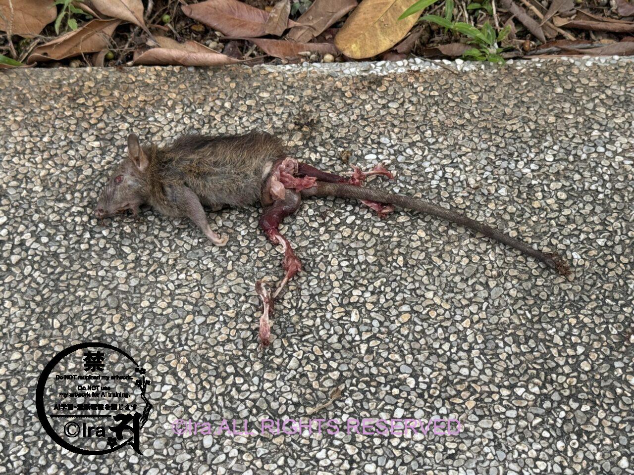 ちなみにネズミの死体は死後30分もすると、体が半分になってました。