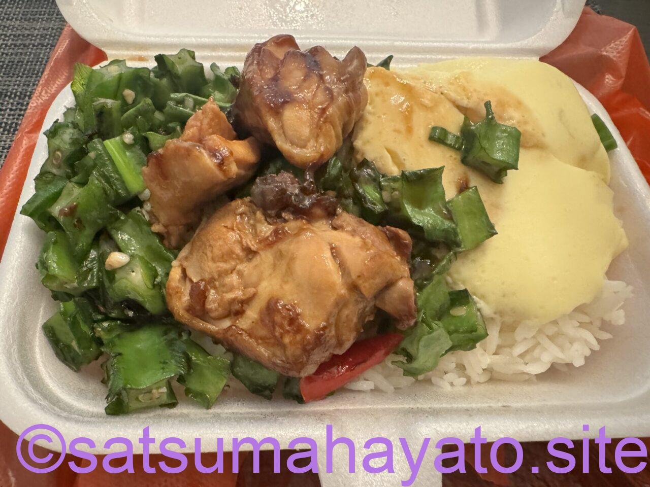オクラの炒め物、茶碗蒸し、味付け豚肉(蒸された)+ライス。