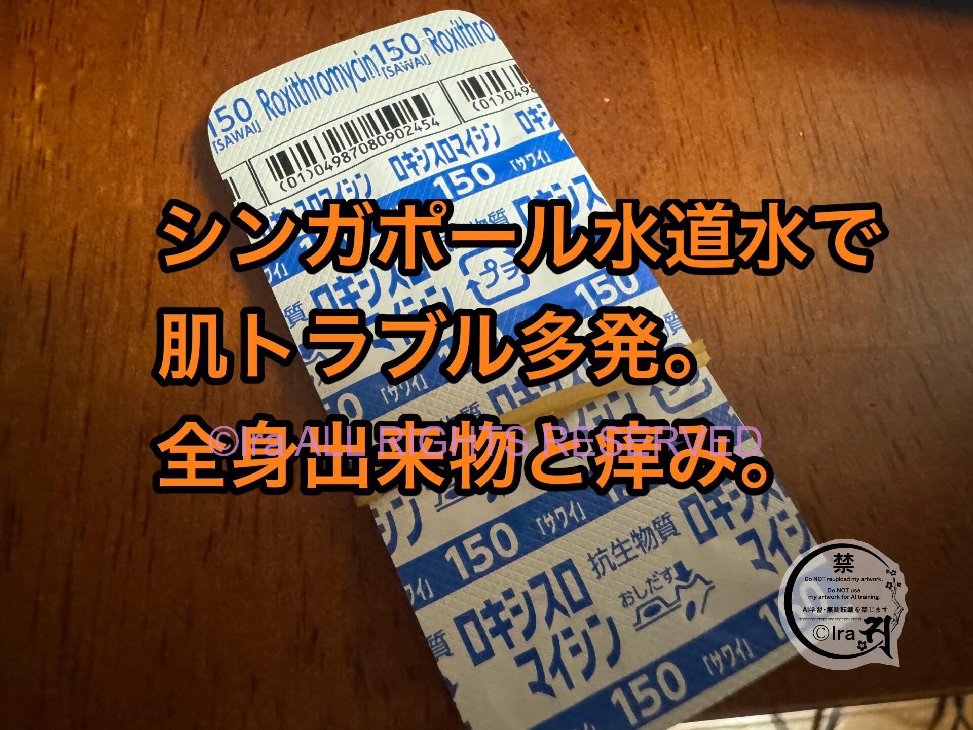 1cmくらいのニキビが顔にボコボコ生じました。医師処方の塗り薬で出来物が2cmを超える大きさになってしまうほど、とても弱いのが僕の肌です。今まで改善に効果があったのは抗生物質服用だけです。けど日本でトラブルおきたときいは3日で改善したのにシンガポールきてからは5日は要するようになりました。肌バリアが水道水で破壊された形。