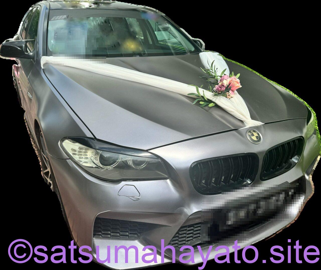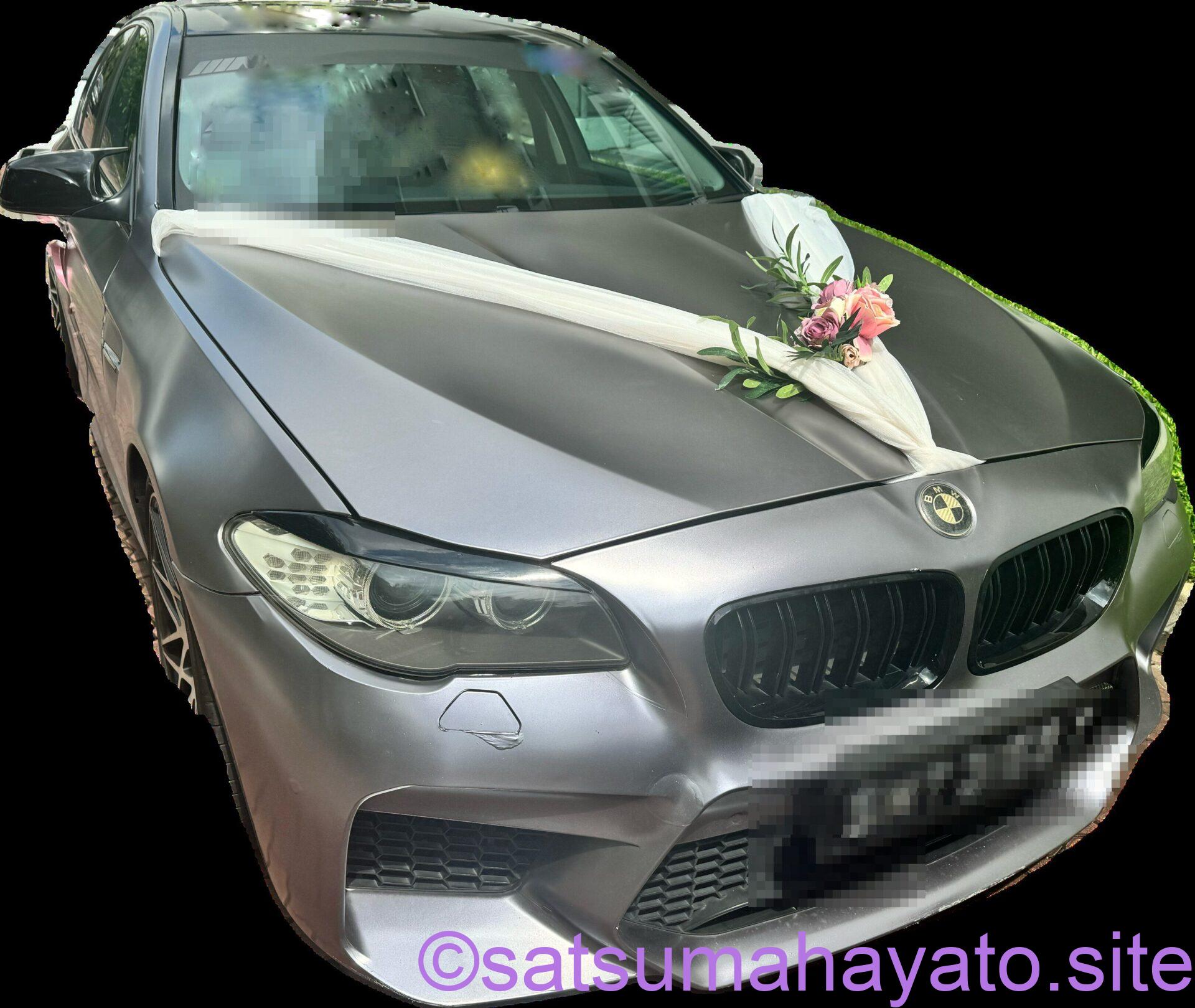 車を会場外でスタンバイさせてる。この飾り付けされた車は花嫁を迎えに行く際に使用。本例ではBMW。BMWでなくてもよい。「レンタカーか、親戚知人のもってる車の中で高級車があればそれ借りる」感じである。