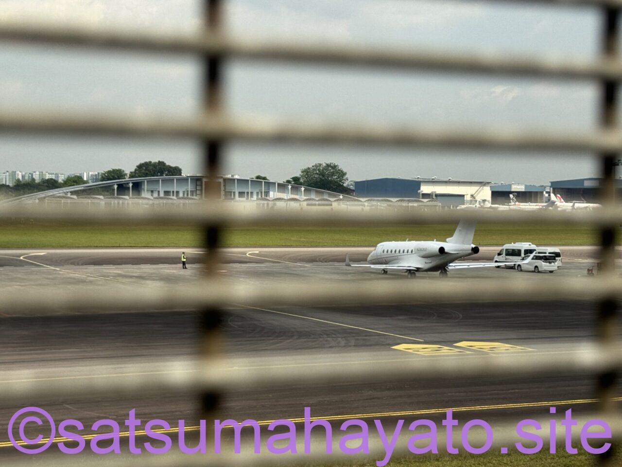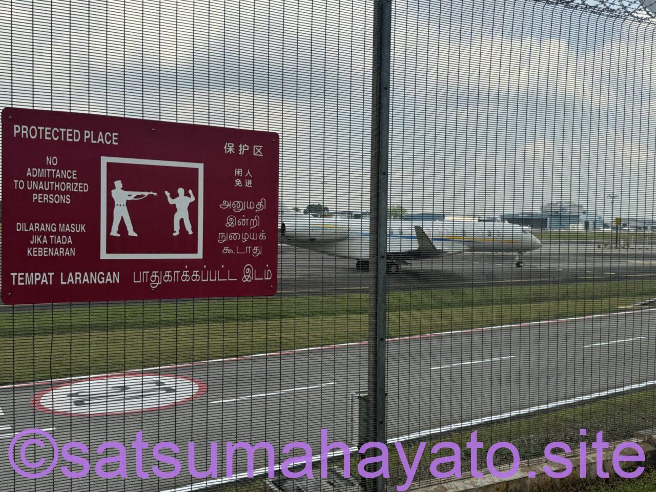 日本の空港と違って、フェンスの目が細かいです。撮影に不向き。シンガポール各地でたびたびみかけるいつもの赤い警告看板がここにもあります。