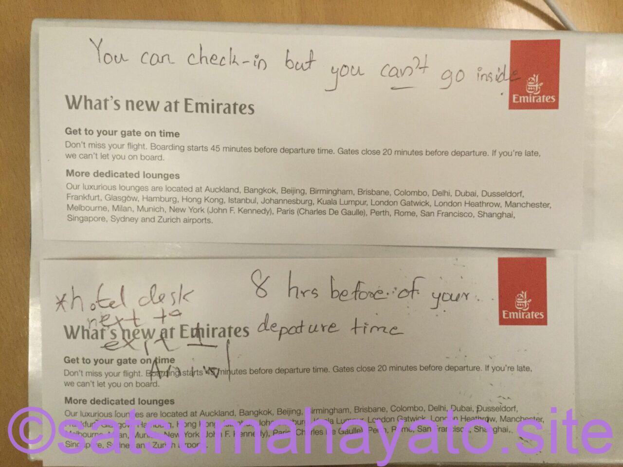 エミレーツ航空は乗り換えまでに24時間を超過する場合、預けていた手荷物を引き取らないといけません。これはドバイ空港についてから知りました。エミレーツ航空のフロントにいた女性が下記英語を書いて僕に渡しました。