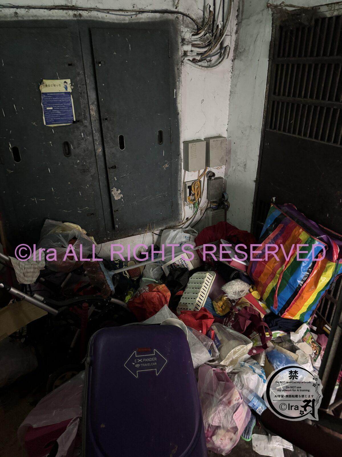 階段にはスーツケースの他多くのゴミが放置されています。