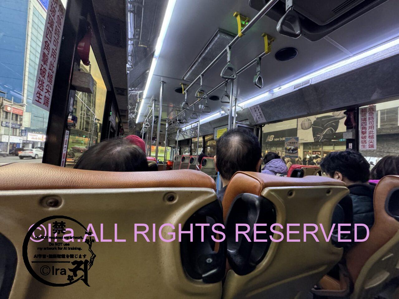 この水色のバスに乗っていきます。島民優先ではない。早い者勝ち座席。通勤ラッシュ時でも満席はなかったが9割は埋まっていた。バスは30分に1本程度。