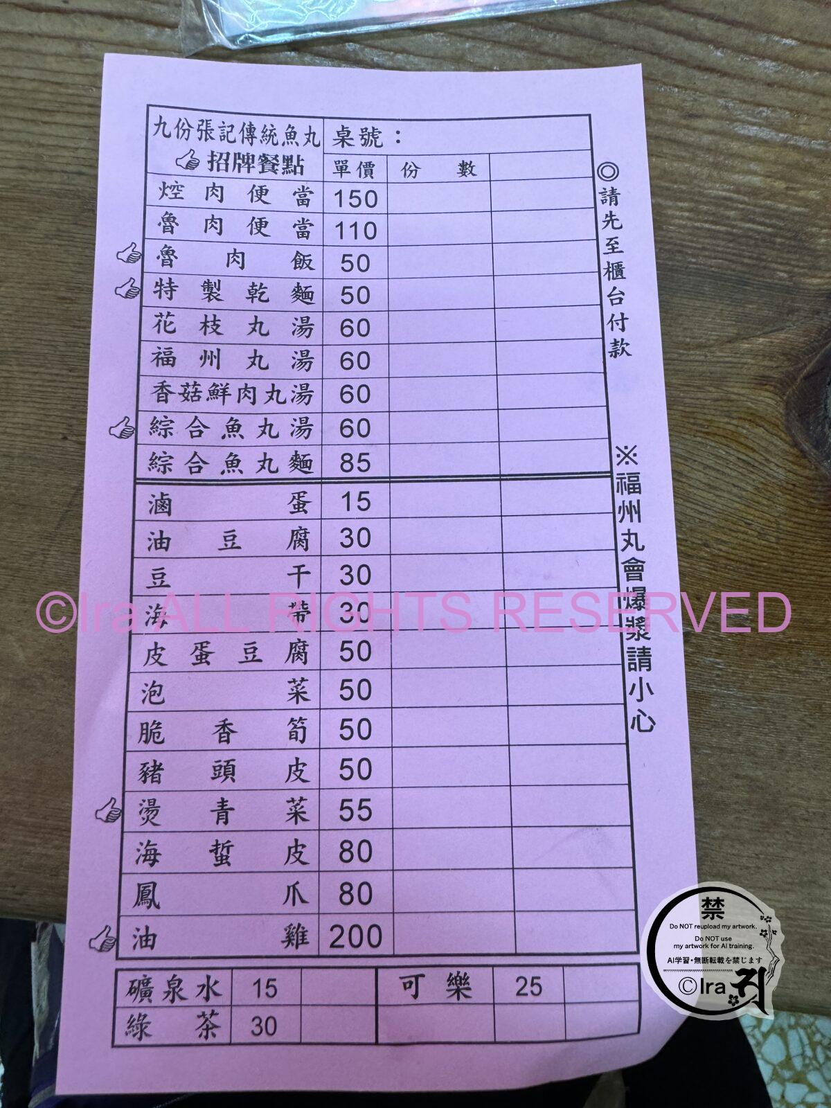 九份の人気台湾料理店.張記傳統魚丸(Zhang Ji Traditional Fishballs)メニュー