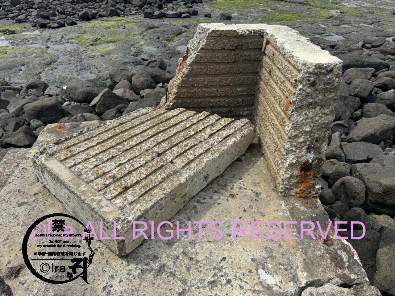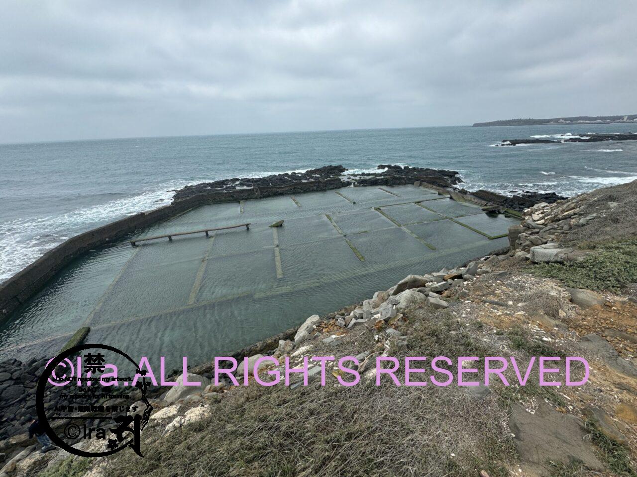 干潮と満潮の満ち引きを活用した漁法もかつて行われていた。その跡がこちら。僕は干潮に近い時間帯に行きました。この時間帯だと通常は海水があまり入っていないそうですが、この日は瞬間風速が50m近かったためか海水がいくぶん入り込んだのかもしれません。干潮時には岩をほぼ真下から眺めることも可能です。ただし足腰弱い人は足元気をつけてください。石は不安定だし強い突風はあるしで、成人男性でもよろめきながら歩いていました。