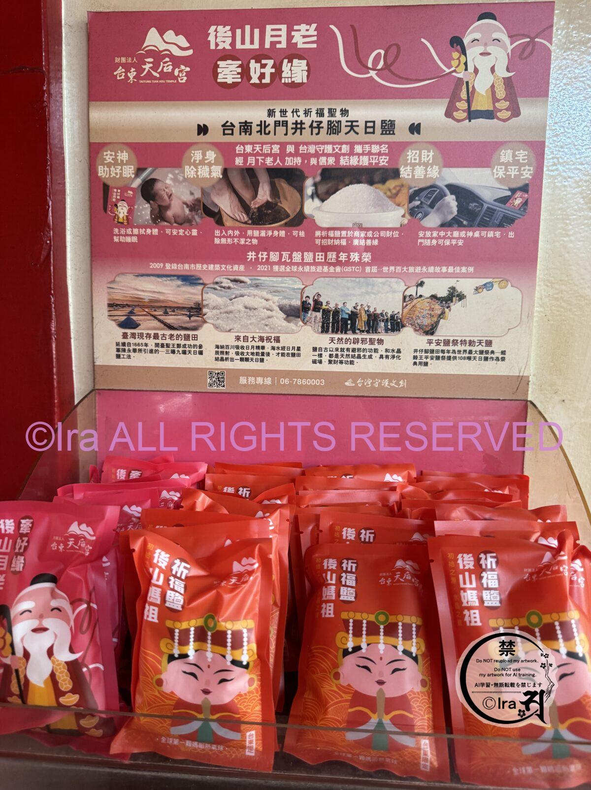 日本の神社の塩は小さい粒子で食用可能サイズですが、こちらは非食用。かつ粒が大きい。